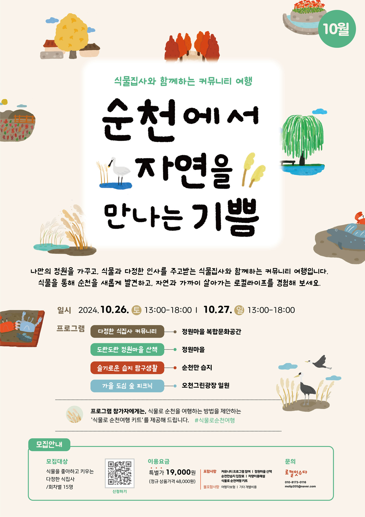 식집사 커뮤니티 모임과 식물로 로컬 순천 여행을 함께 즐기는 프로그램으로, 전 일정 참여가 가능하신 분만 신청 바랍니다.
